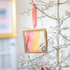 The best selling "Merry and Bright" Collection features original abstract artworks in elegant scalloped brass frames with glass, making each piece truly one-of-a-kind. Measuring 3"x3" and adorned with a pink ribbon, each ornament comes with an easel and a pink organza bag—perfect for gifting and display.