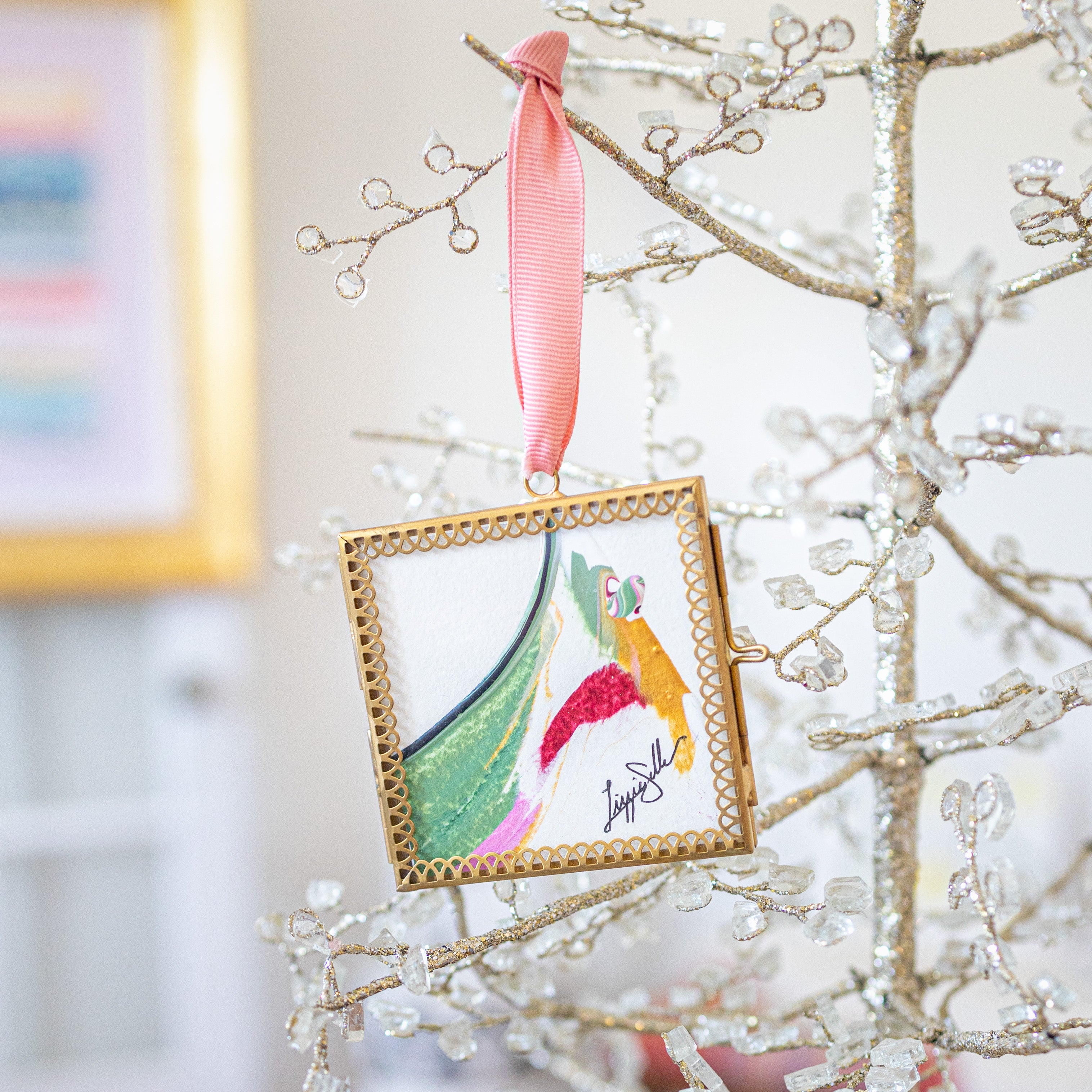 The best selling "Merry and Bright" Collection features original abstract artworks in elegant scalloped brass frames with glass, making each piece truly one-of-a-kind. Measuring 3"x3" and adorned with a pink ribbon, each ornament comes with an easel and a pink organza bag—perfect for gifting and display.