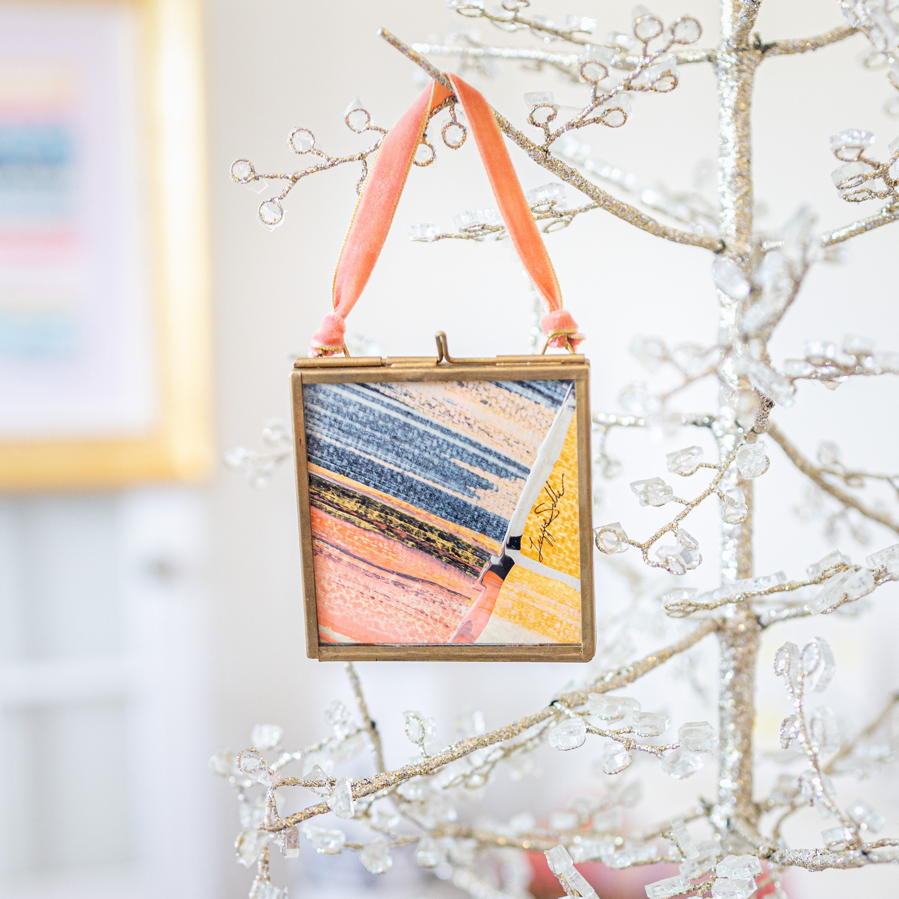The best selling "Merry and Bright" Collection features original abstract artworks in elegant scalloped brass frames with glass, making each piece truly one-of-a-kind. Measuring 3"x3" and adorned with a pink ribbon, each ornament comes with an easel and a pink organza bag—perfect for gifting and display.