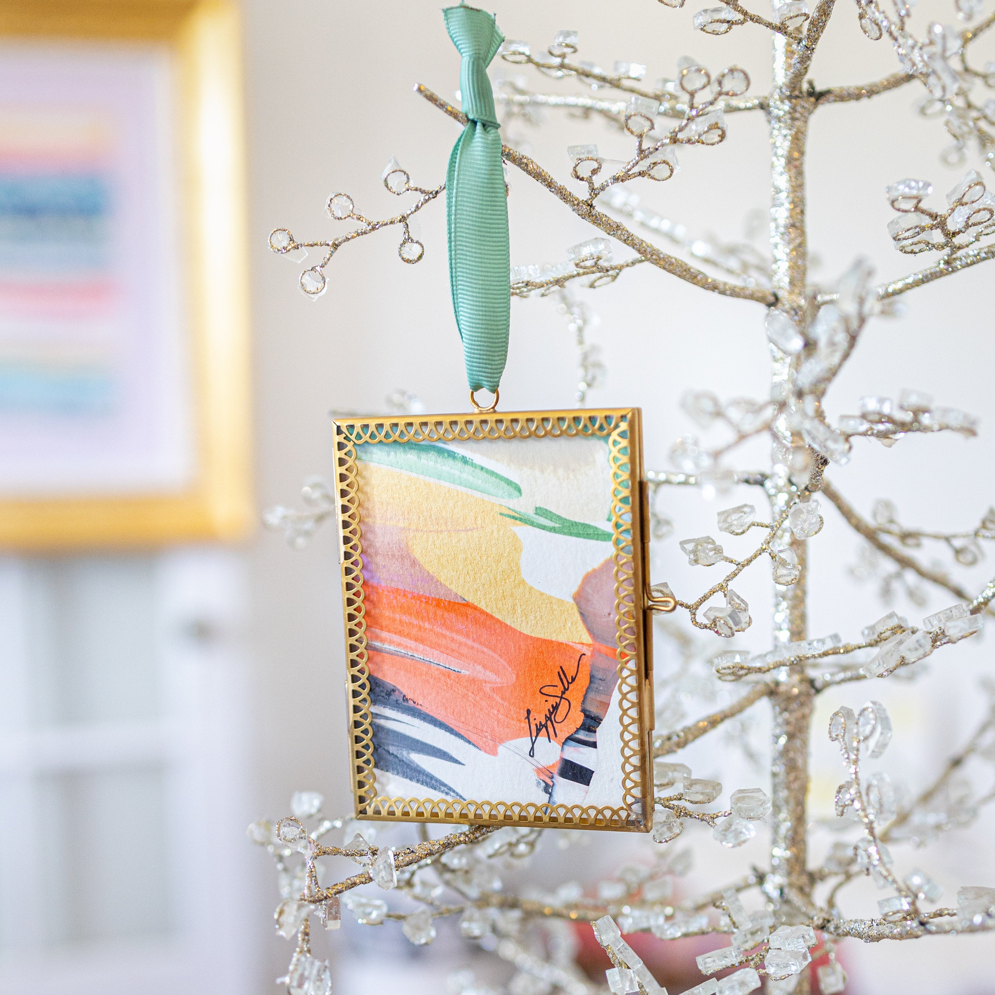 The best selling "Merry and Bright" Collection features original abstract artworks in elegant scalloped brass frames with glass, making each piece truly one-of-a-kind. Measuring 3"x4" and adorned with a pink ribbon, each ornament comes with an easel and a pink organza bag—perfect for gifting and display.