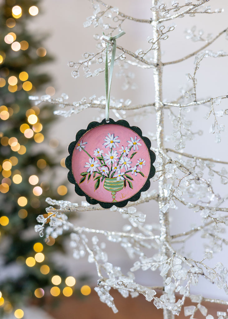 Transform your holiday tree into a gallery of color and joy. Jennifer Jayne’s hand-painted floral ornaments, framed in whimsical scallops, celebrate the beauty of art in every detail.