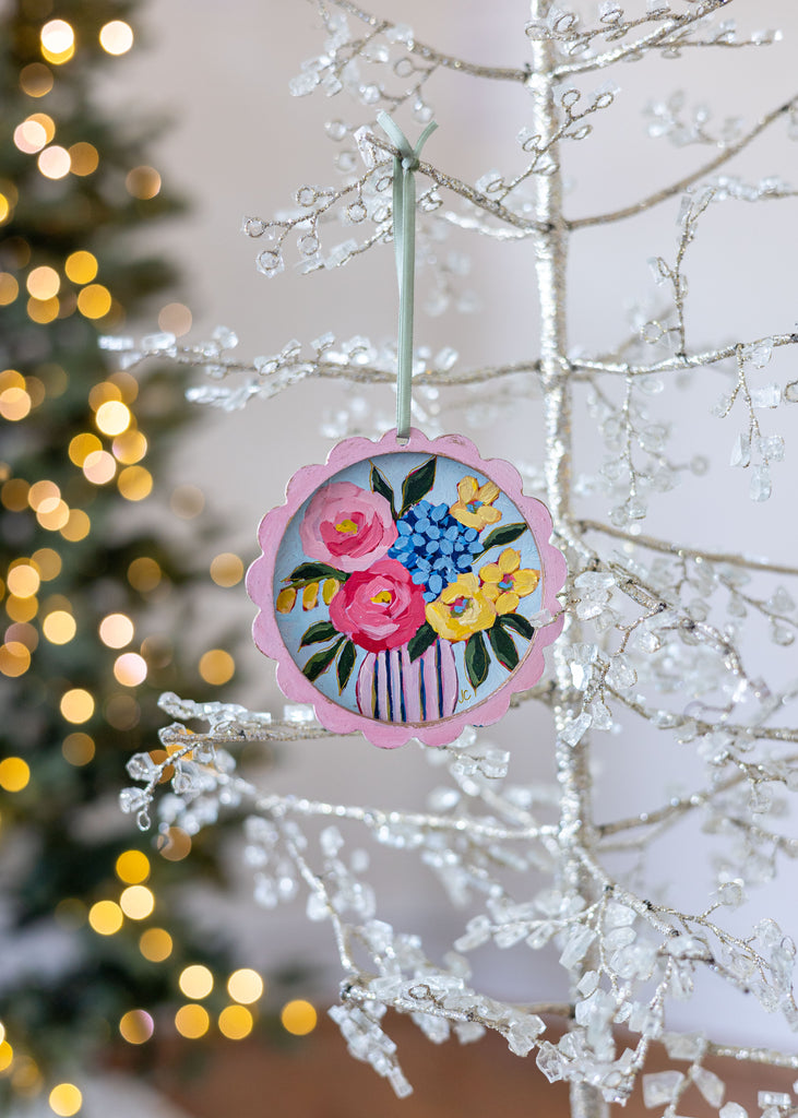 Transform your holiday tree into a gallery of color and joy. Jennifer Jayne’s hand-painted floral ornaments, framed in whimsical scallops, celebrate the beauty of art in every detail.