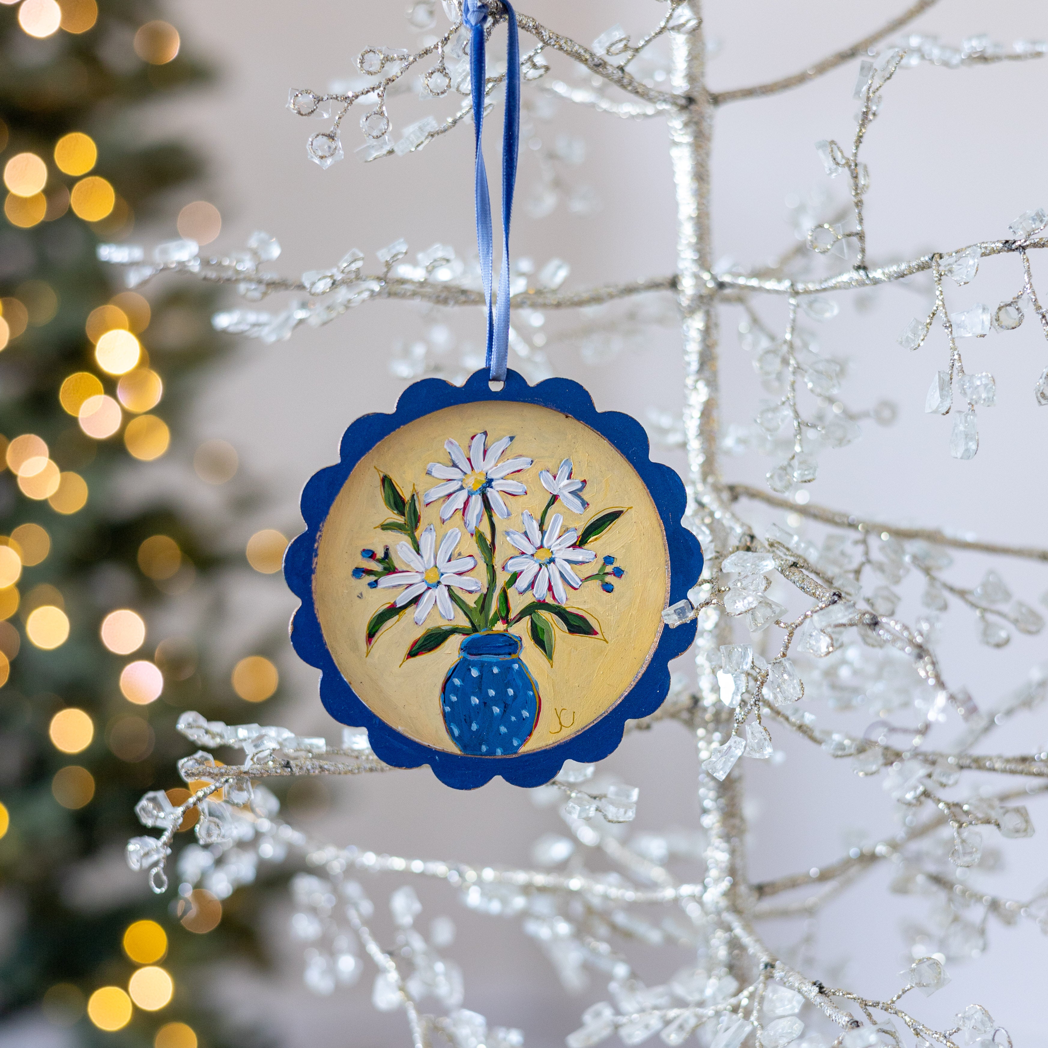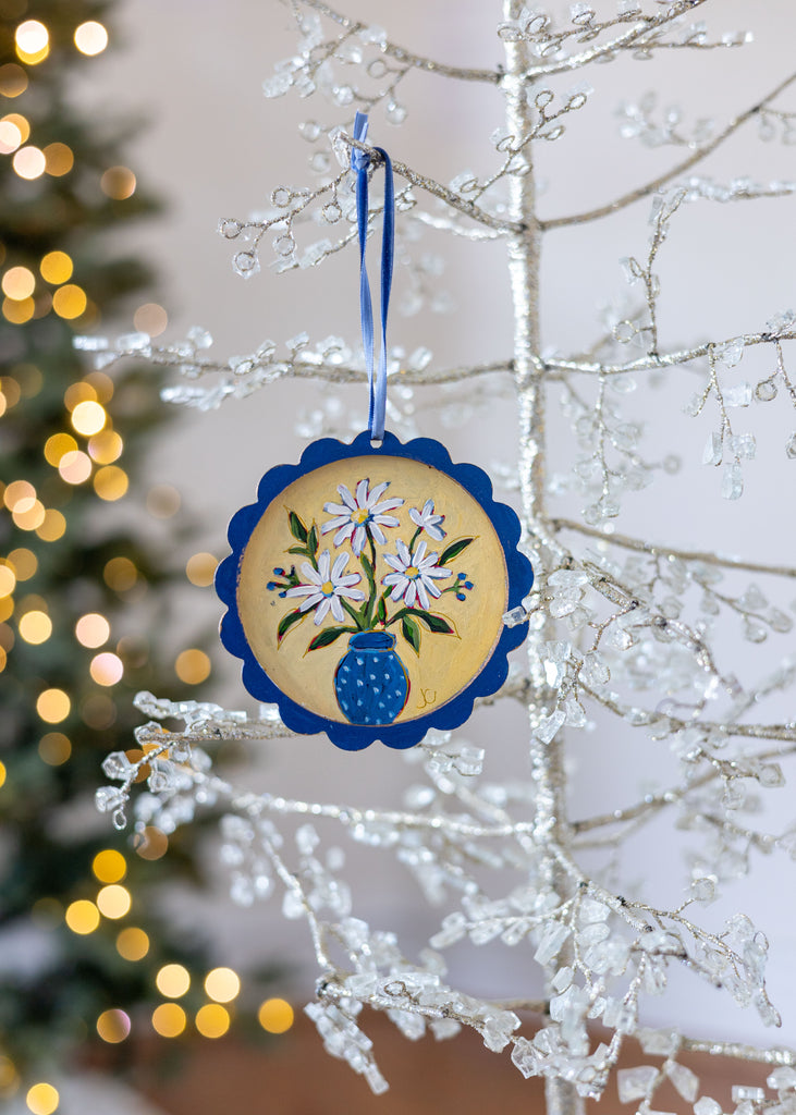 Transform your holiday tree into a gallery of color and joy. Jennifer Jayne’s hand-painted floral ornaments, framed in whimsical scallops, celebrate the beauty of art in every detail.