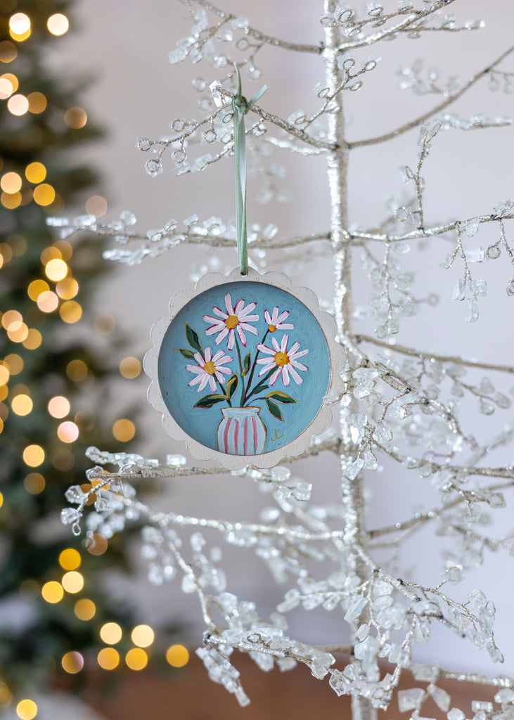 Transform your holiday tree into a gallery of color and joy. Jennifer Jayne’s hand-painted floral ornaments, framed in whimsical scallops, celebrate the beauty of art in every detail.