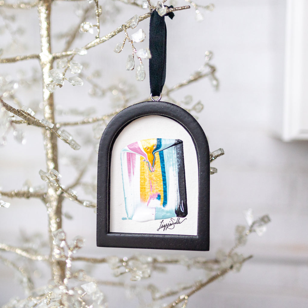 / Jingle Bell Original Art Ornament - Blue Gold with Pink Teal and Black Streaks Swish