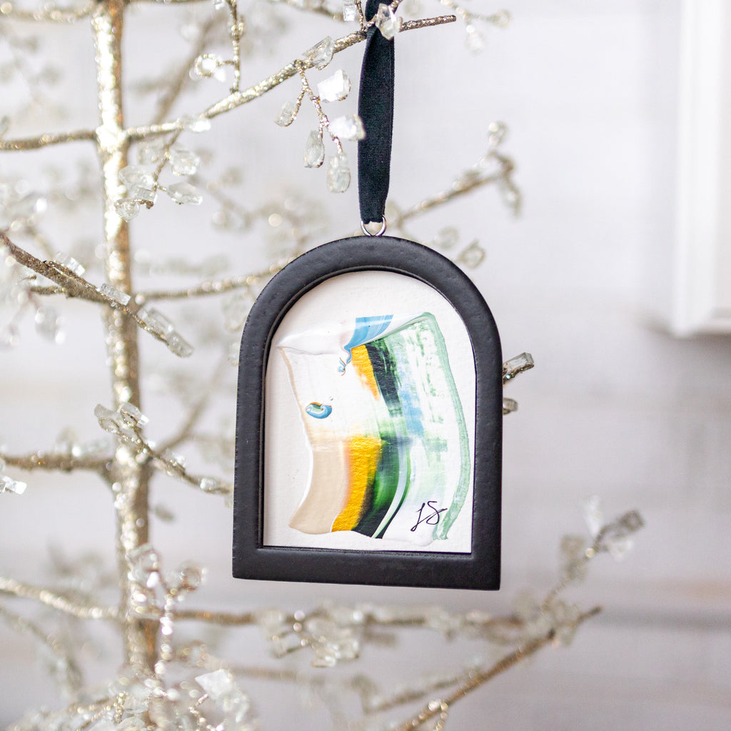 / Jingle Bell Original Art Ornament - Tan Gold Green Curved Swish