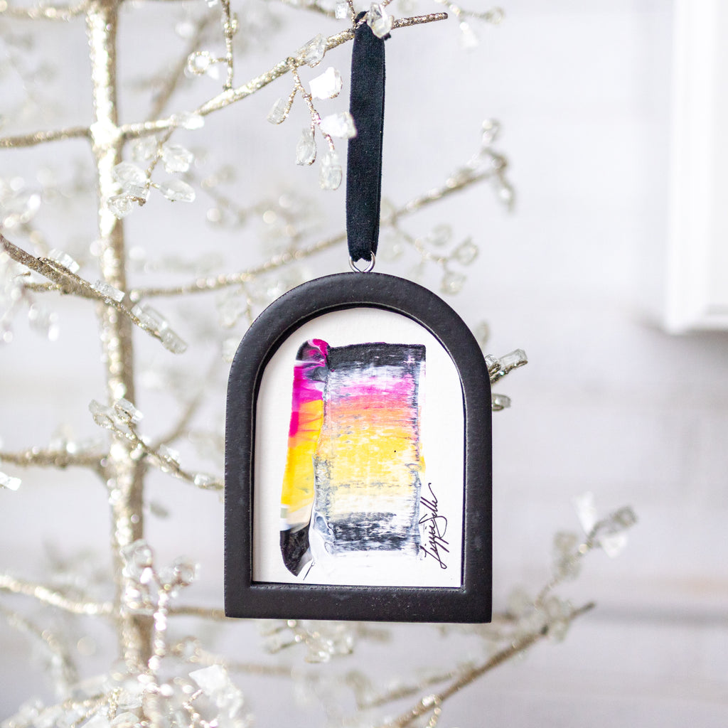 / Jingle Bell Original Art Ornament - Yellow Black Raspberry Swish Horizontal