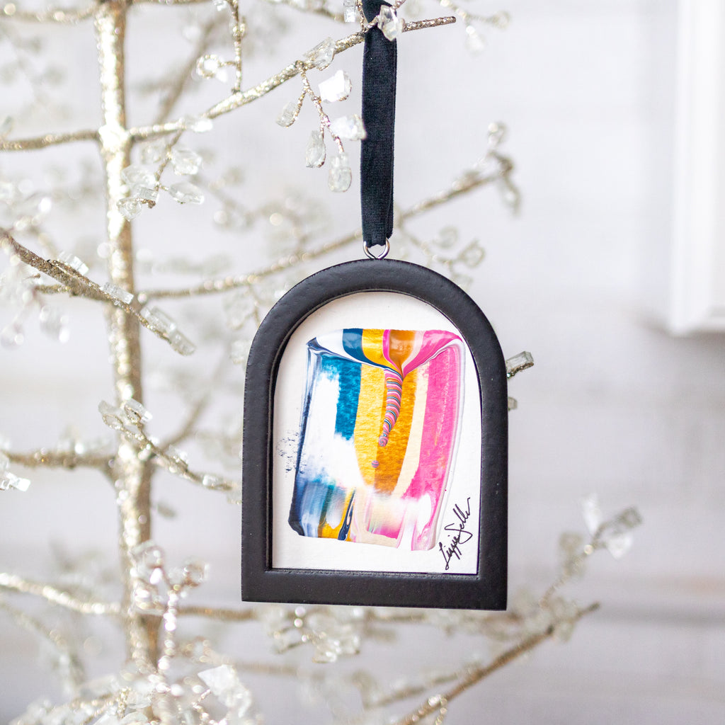 / Jingle Bell Original Art Ornament - Rich Striped Swish with Twist Blue, tan, magenta