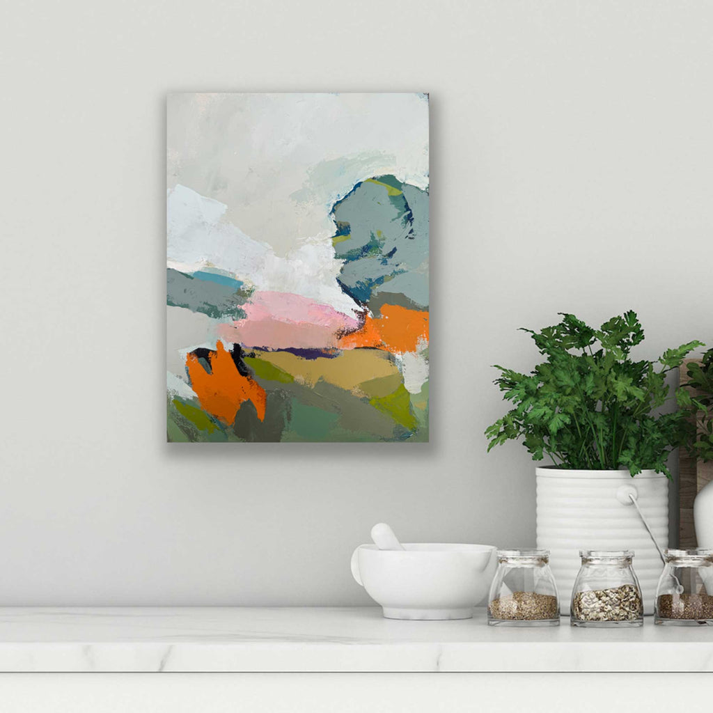 With A Moment’s Focus, my aim was to keep the landscape simple, allowing the stillness of form and color to mirror the calm of slowing down and being present.